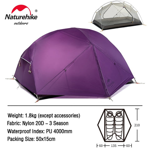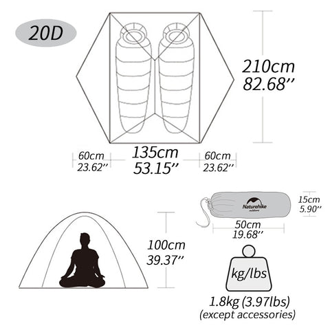 This phenomenal 20D Ultralight Travel Tent has an incredible weight of 1810g and is ideal for 1-2 people! With a spacious structure of 210 +65+65x125x100cm, it's perfect for three-season camping. An aluminum alloy pole and double layers of 20D wire grid nylon plaids make it waterproof and durable! Not to mention, the package includes a whopping 1.9kg (4.19lb.) of tent pegs and is 50x15 cm in size. Its waterproof index rating is >3000mm. Get ready for the ultimate camping experience with this two-person tent!